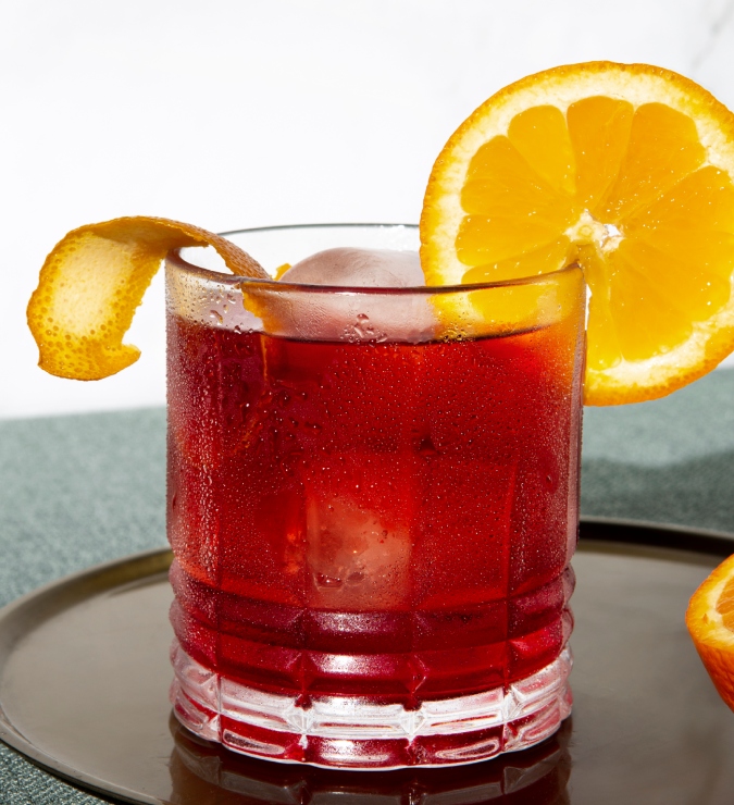 Sirva com gelo grande em um copo baixo e use cítricos simples como garnish.