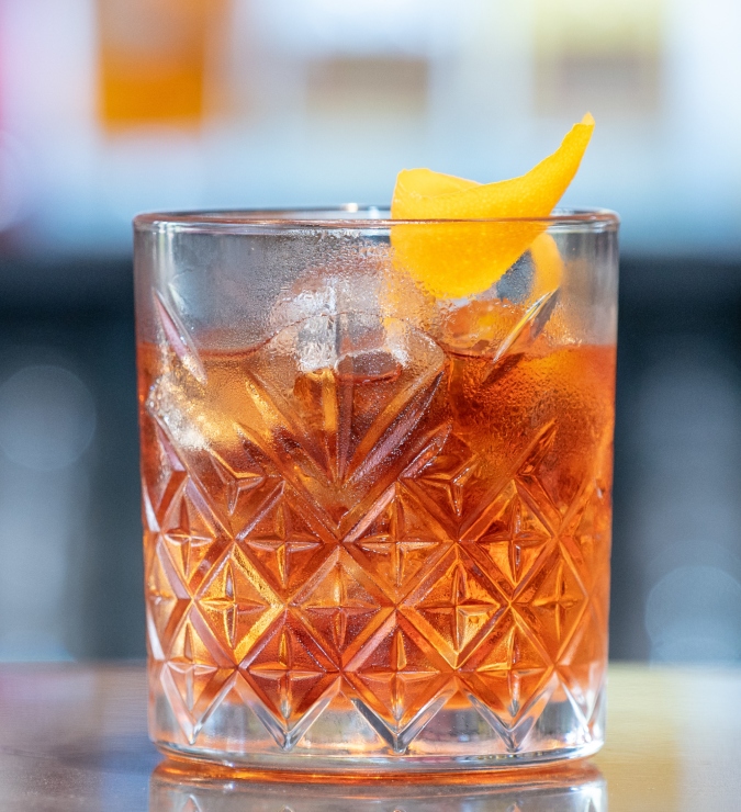 Em um copo de fundo largo com bastante gelo, adicione as doses de gin, de bitter e de vermute. Mexa por 15 a 20 segundos e coe para um copo baixo com pedras de gelo. Torça a casca de laranja sobre o copo para aromatizar o drink e deixe-a sobre o gelo para finalizar.